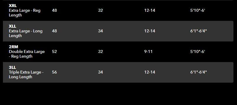 - 2nd letter indicates size in length of leg, R being regular and L being long
